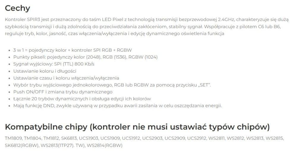 Kontroler SPIR3 jest przeznaczony do taśm LED Pixel, Cyfrowych, Digital, Magic, Płynących itd.
